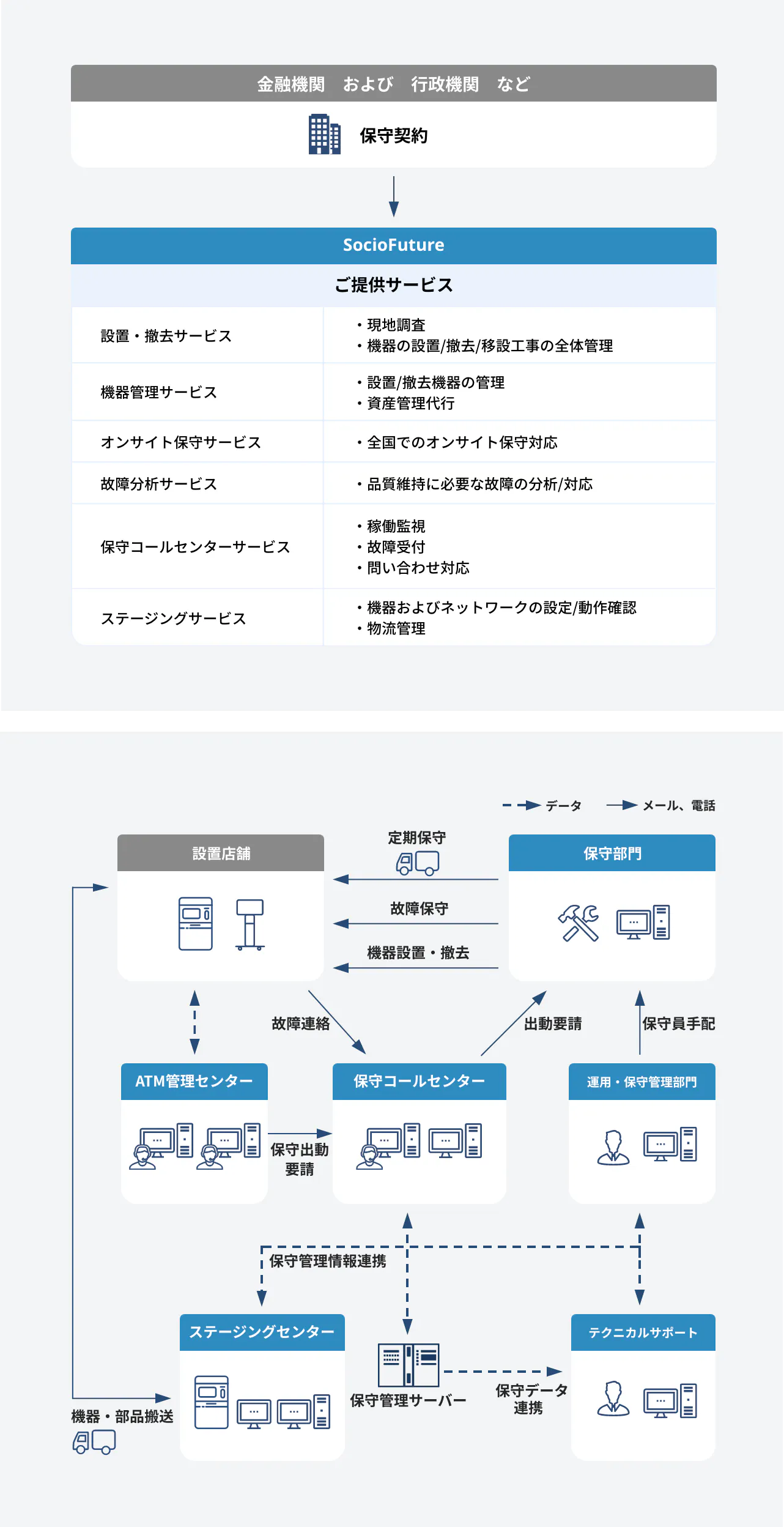 全国に展開するATM機器の保守実績を有し、キッティング、資産管理の代行、コールセンターによる問合せ対応、現場でのオンサイト保守や点検、センドバック修理などを行っております。